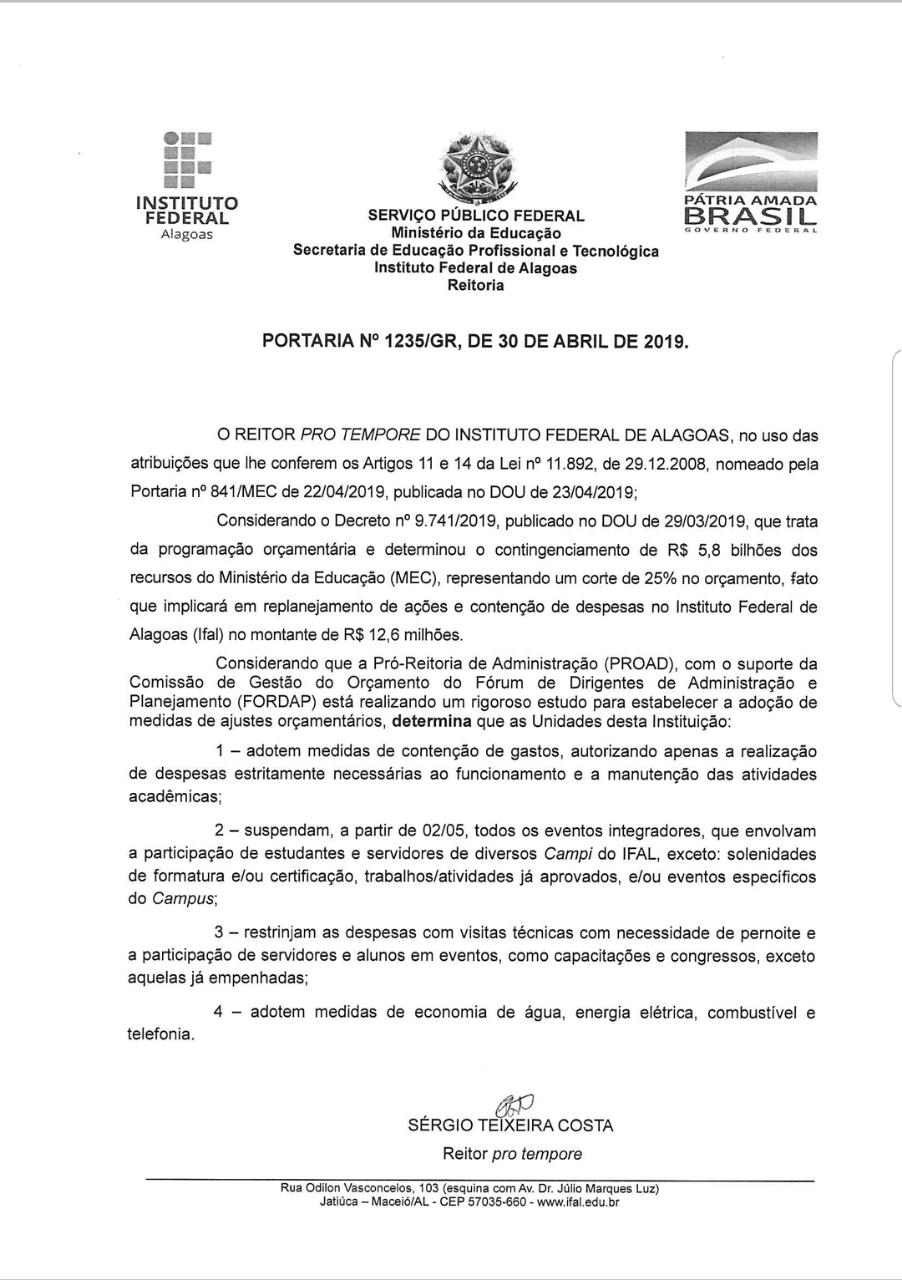 O Instituto Federal de Alagoas, através da portaria nº 1235/GR, do dia 30 de abril, orientou a contenção de gastos na instituição pretendendo economizar R$ 12,6 milhões e se adequar no corte de R$ 5,8 bilhões do orçamento do MEC realizado pelo governo Bolsonaro.