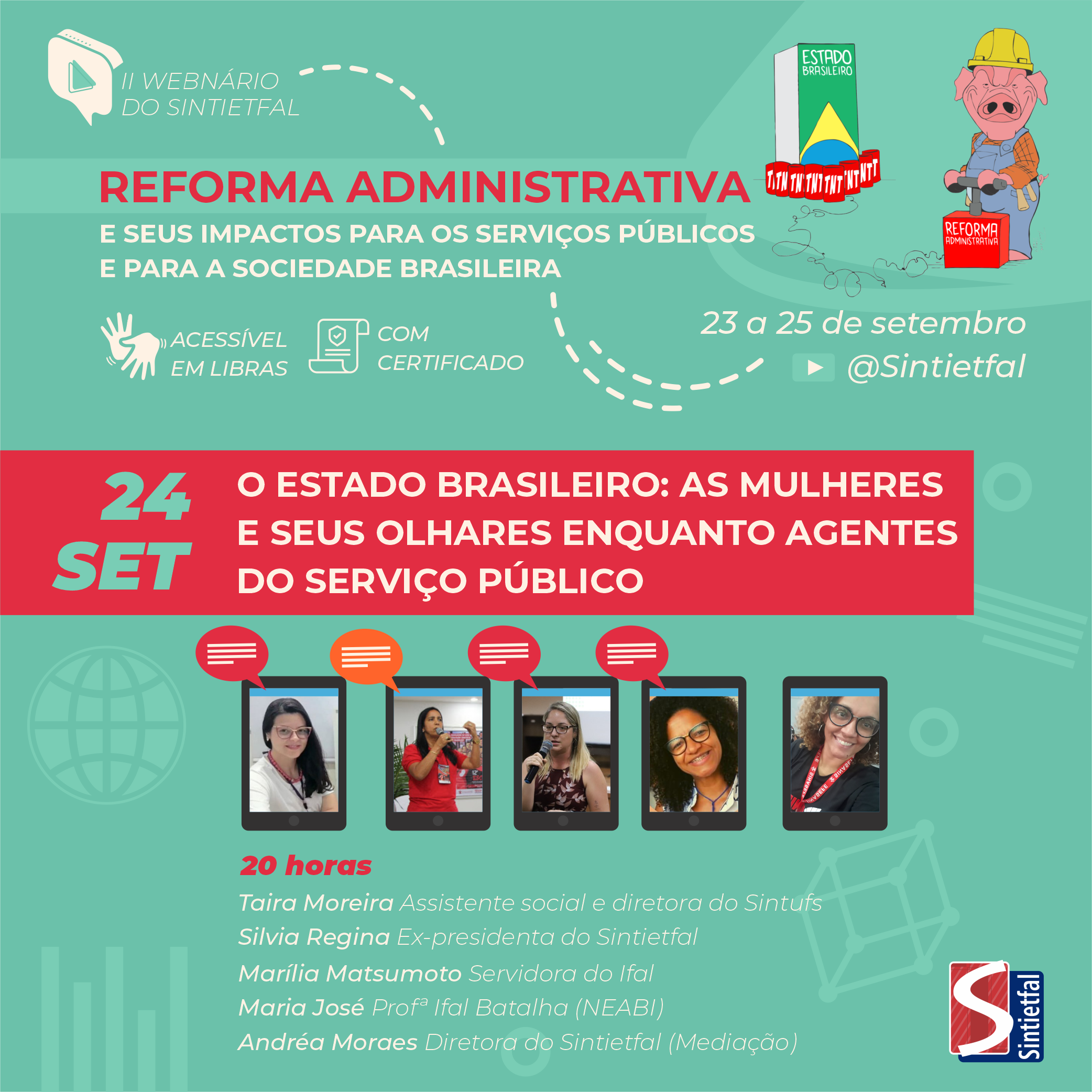 A Reforma Administrativa (PEC 32/2020) de Bolsonaro e Paulo Guedes é o tema do II Webnário do Sintietfal. O evento começa já nesta quarta-feira, 23 de setembro, às 15 horas, e segue até o dia 25. A transmissão dos debates será ao vivo pelo canal do Sintietfal no youtube.